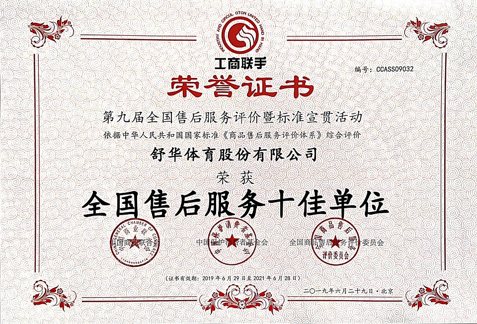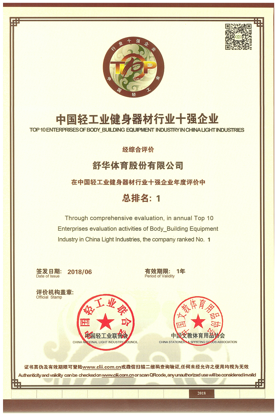 2017至2018年,球王会体育连续两年以第一名入围年度“中国轻工业健身器材行业十强企业”;2018年,球王会体育入驻平昌冬奥会“中国之家”,同年荣获“中国健身器材行业最具影响力品牌”。 From 2017 to 2018, Shuhua was named the "Top 10 Enterprise of Body Building Equipment Industry in China Light Industries " for the second consecutive year. In 20