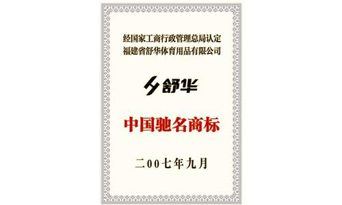 “球王会体育”商标经国家工商行政管理总局认定为“中国驰名商标”。 Shuhua was recognized as “Famous Trademark of China” by SAIC